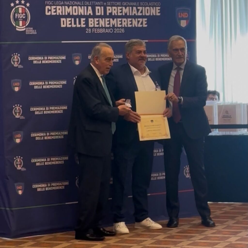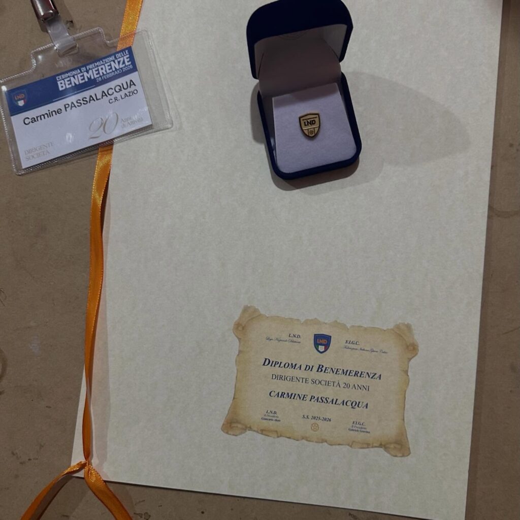 Oggi 28 Febbraio 2026 alle ore 11:00 presso l’hotel Hilton di Roma Fiumicino ho ricevuto un riconoscimento per gli oltre 20 Anni di Impegno Profuso tra Prima Squadra e Settore Giovanile nella LND, sono stato premiato da Abete e Gravina alla Presenza di innumerevoli personalità attive nel Mondo del Calcio.